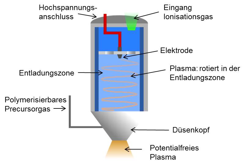 Bei diesem Verfahren wird das Prozessgas durch die Plasmazone geführt und strömt dann als aktiviertes Gas auf das Substrat. Das Plasma selbst wird über einen Lichtbogen erzeugt. Wesentlich dabei ist, dass die Plasmadüse, über die der Plasmastrahl aus dem Reaktor nach außen dringt, geerdet ist. Dadurch werden die beim Austrittsprozess auftretenden Entladungsprozesse im Inneren zurückgehalten und es tritt nur das potentialfreie Down-Stream-Plasma strahlförmig aus, wobei die Strahllänge in Abhängigkeit von der verwendeten Düse bis zu 30 mm betragen kann. Dies ermöglicht eine dreidimensionale Behandlung und Beschichtung von Substraten.