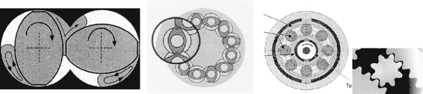 Eine Alternative zur diskontinuierlichen Mischungsherstellung im Innenmischer stellen kontinuierliche Mischverfahren dar. Hierbei werden die kontinuierlichen Mischaggregate Doppelschnecken-, Mehrwellen- und Planetwalzenextruder eingesetzt (Bild 1). Eine Voraussetzung für diese Technik ist, dass die Rohstoffe in die kontinuierliche Verfahrenseinheit dosiert werden können. In einem kontinuierlichen Mischverfahren ist der Energieeintrag in die Kautschukmischung über die Zeit konstant und die Mischung erfährt eine einheitliche Vorgeschichte. Dieses gewährleistet eine hohe Homogenität der hergestellten Mischung. Durch die Temperierung des Mischaggregates ist eine exakte Temperaturführung möglich, und die Staubbelastung am Arbeitsplatz ist geringer. Der kontinuierliche Prozess vereinfacht zudem die Automation und erlaubt eine verbesserte Verfahrenskontrolle. Einen weiteren Vorteil des kontinuierlichen einstufigen Mischverfahrens im Gegensatz zum Mischen in Innenmischern ist die Einsparung von Verfahrensschritten, wodurch die notwendige Arbeitszeit und gegebenenfalls auch die Mischenergie verringert wird. Zusätzlich ist die Staubbelastung am Arbeitsplatz geringer.