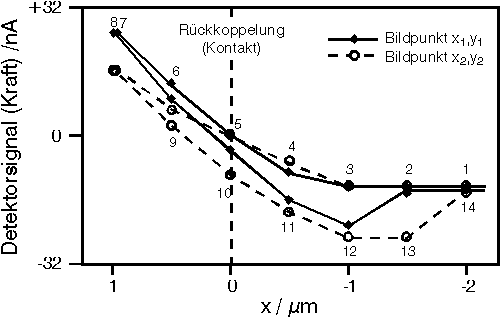 Punktuelle Kraft-Abstands-Kurven werden zur spezifischen Kontrastgebung und zur Beurteilung der “Härte” bzw. der “Adhäsion” genutzt. In Abbildung 2 sind schematisch solche Kurven für zwei Materialien mit unterschiedlicher Vernetzungsdichte gezeigt. Die gestrichelte Kurve steht für ein Material geringer Vernetzungsdichte, die durchgezogene für ein Material höherer Vernetzungsdichte. Deutlich zu erkennen ist der Härteunterschied im Druckbereich (0 bis 1 µm) sowie der Adhäsionsunterschied bei Rückzug der Spitze (0 bis -2 µm, “Klebrigkeit”). Damit wird eine Detektion von Vernetzungsdichteunterschieden mit nm-Auflösung möglich.