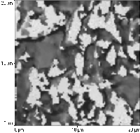Die Technik kann für eine spezifische Kontrastgebung genutzt werden, da verschiedene Kautschuktypen anhand der Steifigkeit im Druckbereich und an der Reichweite der “Adhäsion” unterschieden werden können. Eine Kombination topographischer Aufnahmen mit der Kraftkurvenaufzeichnung ist in Form der Schichtenrasterung möglich. Hier wird in jedem Punkt eines Bildausschnitts eine Kraftkurve wie in Abbildung 2 gefahren. Wählt man den Punkt 13, so ergibt sich ein Kontrast auf Basis der Adhäsionsreichweite. Abbildung 3 zeigt den auf diese Weise erzeugten Kontrast bei Santoprene 201/73, einen EPDM/PP-Verschnitt. Die Thermoplast- und Elastomerdomänen sind sehr gut erkennbar.