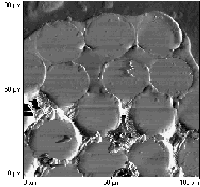 Eine weitere Anwendung spezifischer Kontrastgebungsverfahren ist in der Abbildung 4 gezeigt. Erst kürzlich ist es gelungen, diese Aufnahmen eines Cords in einem Elastomer anzufertigen. Die Härte- und Reibungsunterschiede zeigen außerordentlich klar die einzelnen Filamente, den Dip und die umgebende Elastomermatrix. Härte und Reibung variieren dabei wie erwartet.