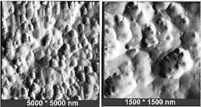In Abbildung 1 sind Topographie-Aufnahmen geschnittener Oberflächen im “non-contact-mode” bei unterschiedlicher Vergrößerung gezeigt. Je nach Vergrößerung können Agglomerate, Aggregate und sogar Primärpartikel des eingesetzten Rußes sichtbar gemacht werden. Über entsprechende Bildverarbeitungsprogramme werden dann Verteilungen der Primärpartikelradien bzw. der Aggregatradien ermittelt.