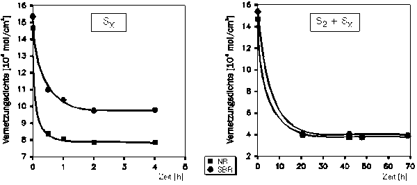Sowohl die dynamischen als auch die Alterungseigenschaften von schwefelvernetzten Vulkanisaten werden durch die Art der Schwefelbrücken (mono-, di-, polysulfidisch) beeinflußt.
